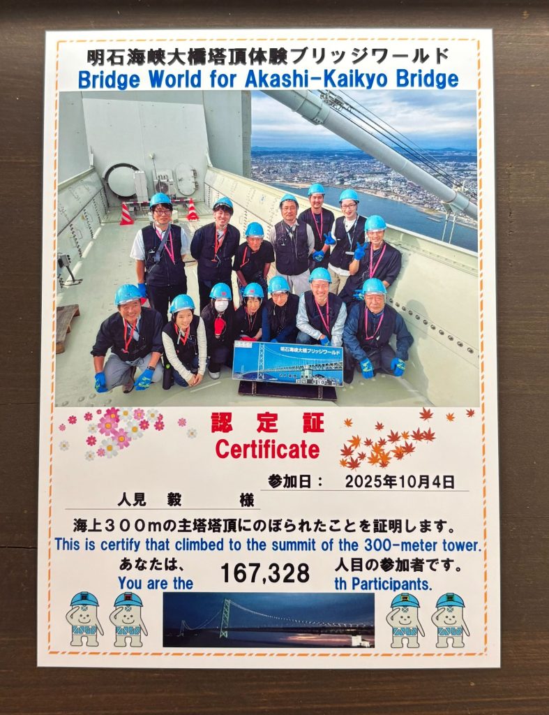 今回、明石海峡大橋塔頂体験に社員旅行で行ってきました。