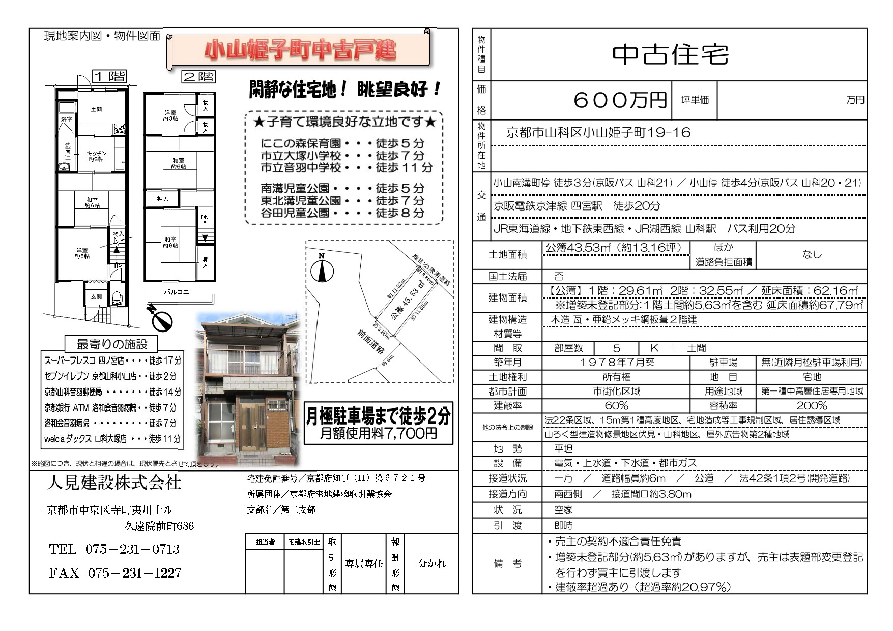 | 備考 | ・売主の契約不適合責任免責 ・増築未登記部分(約5.63㎡)がありますが、売主は表題部変更登記を行わず買主に引渡します。 ・建蔽率超過あり(超過率約20.97%) |