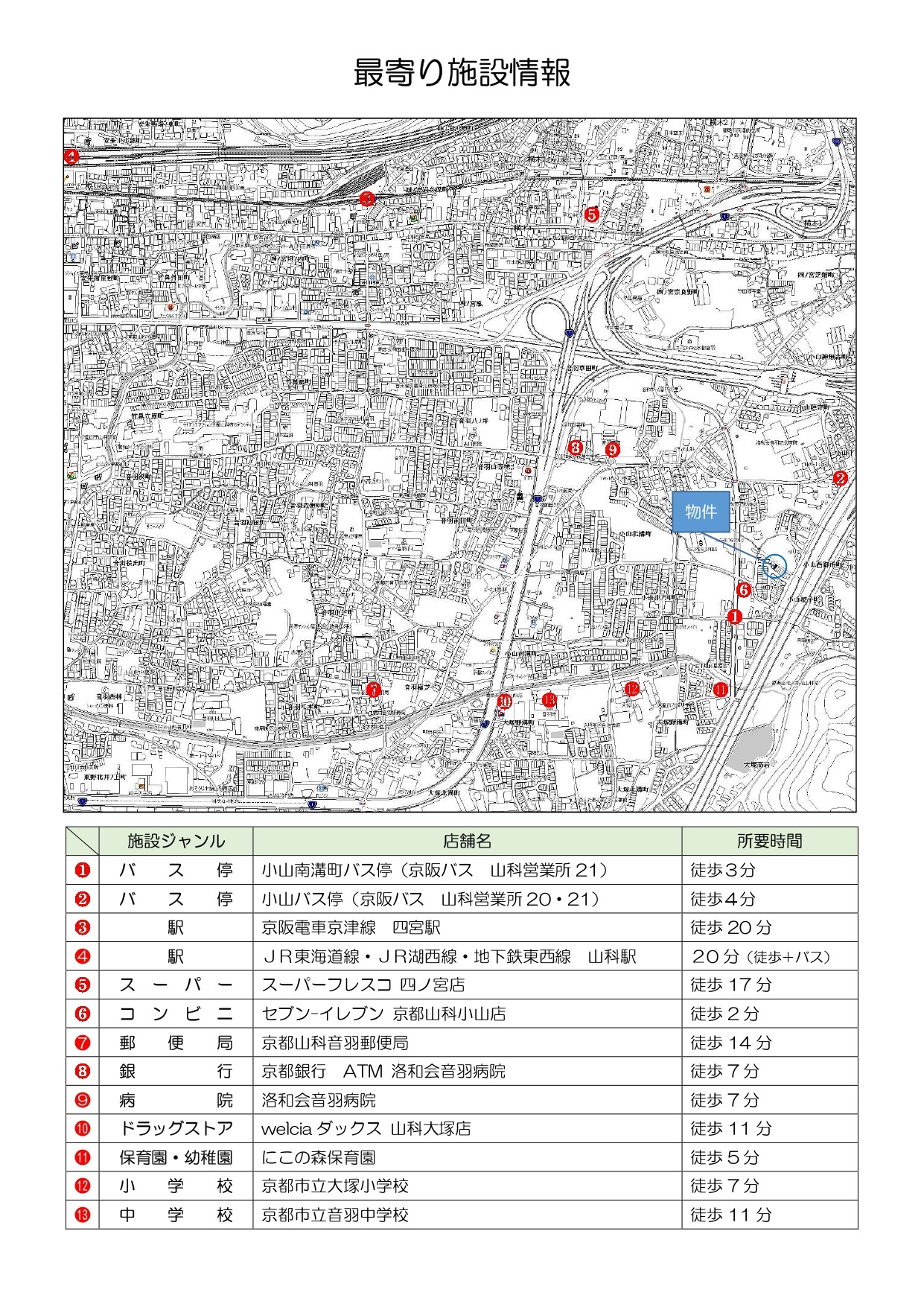 | 法令上の制限 | 法22条区域、15m第1種高度地区、宅地造成等工事規制区域、居住誘導区域、山ろく型建造物修景地区伏見・山科地区、屋外広告物第2種地域 |