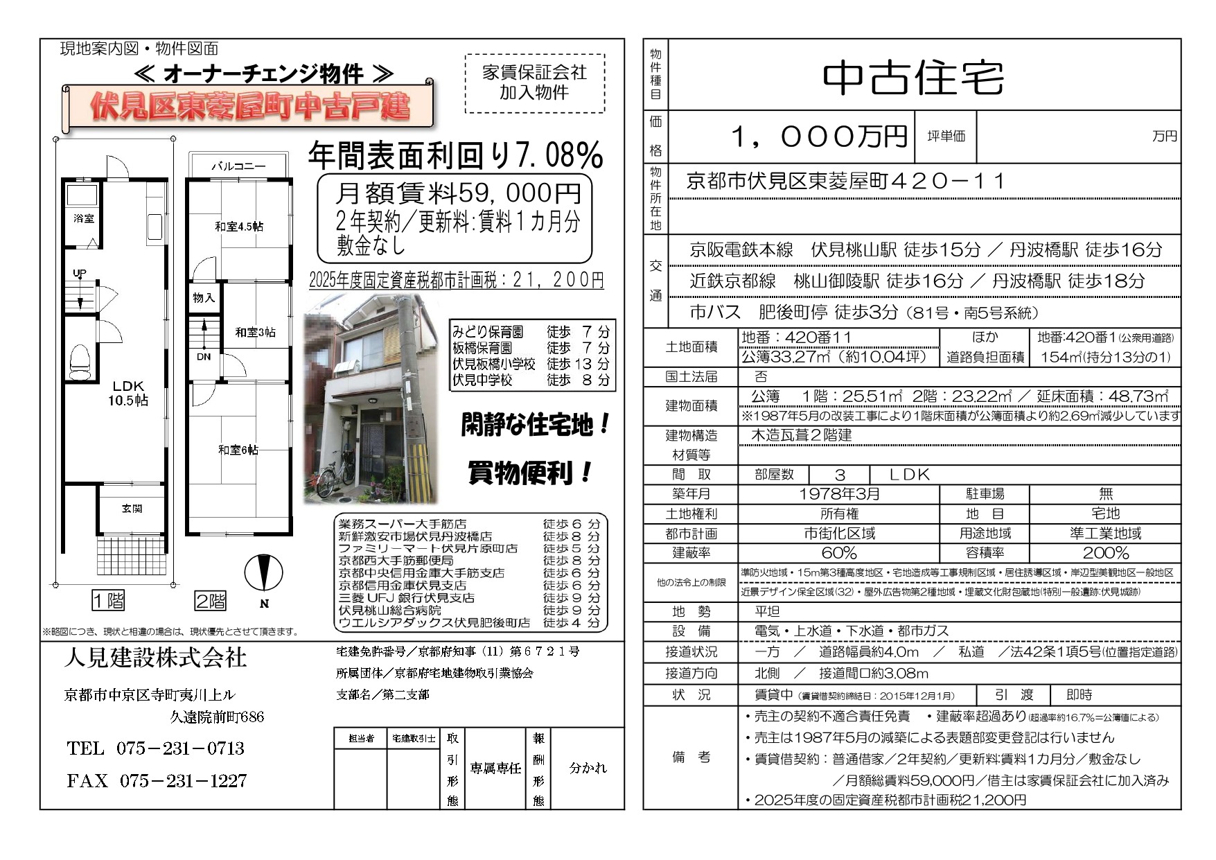 | 備考 | ・賃貸借契約:普通借家/2年契約/更新料:賃料1カ月分/敷金なし/月額総賃料59,000円/借主は家賃保証会社に加入済み ・表面利回り7.08% ・売主の契約不適合責任免責 ・建蔽率超過あり(超過率約16.7%=公簿値による) ・1987年5月の改装工事により1階床面積が公簿面積より約2.69㎡減少していますが、売主は当該減築による表題部変更登記は行いません ・2025年度の固定資産税都市計画税21,200円 |